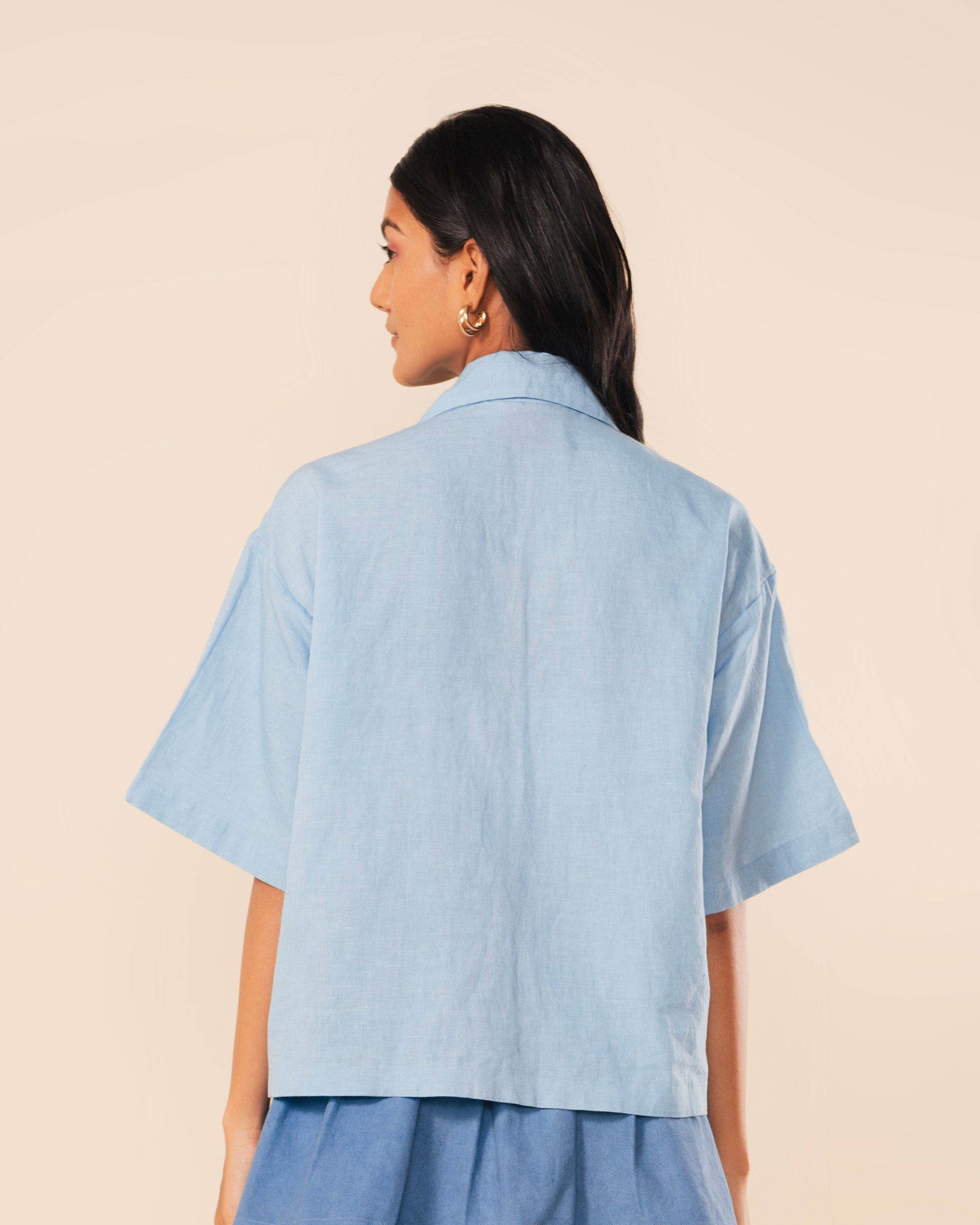 The School shirt is an oversized half-sleeve fit. The shirt is waist length and the ends above the hips.